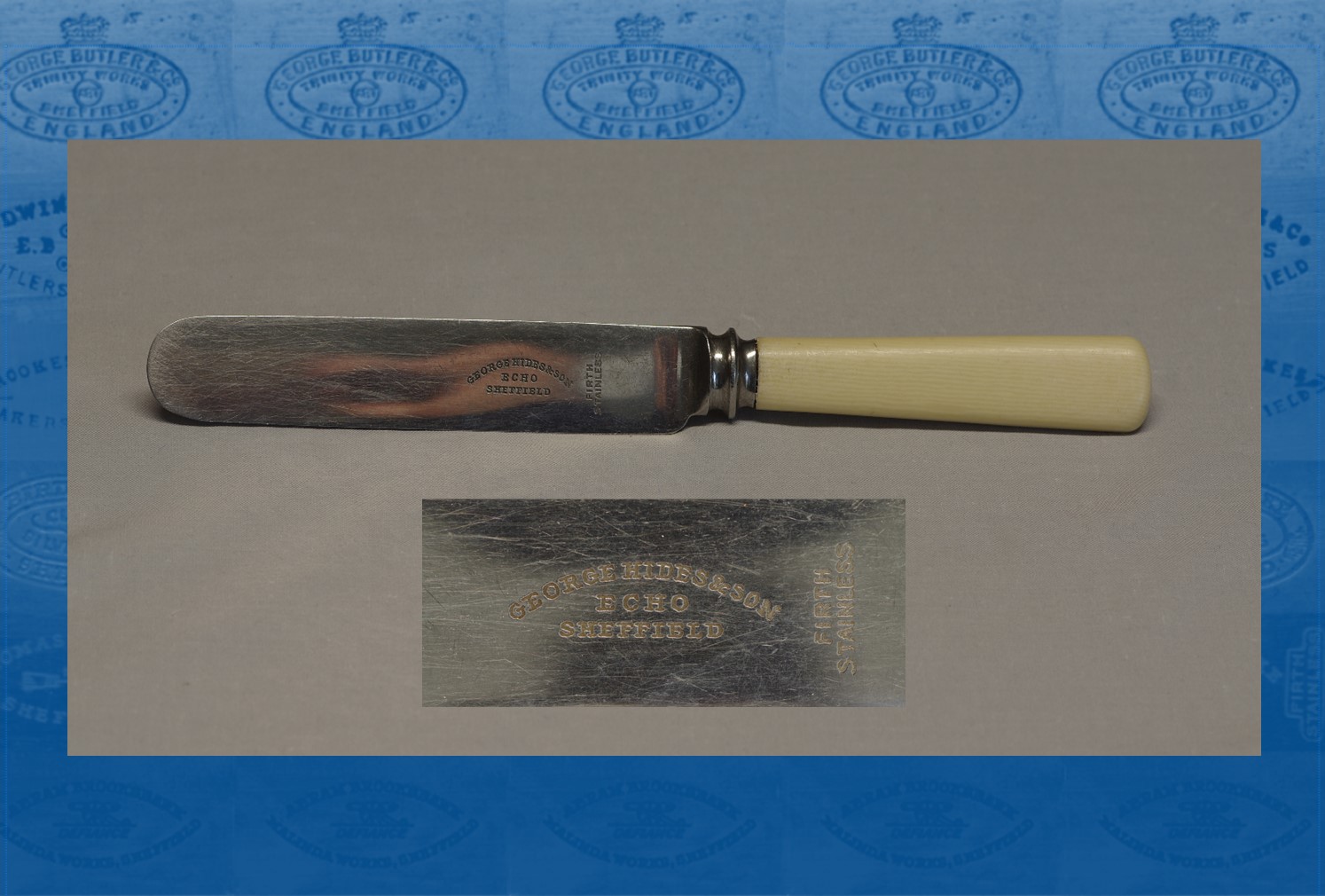 By 1925, the firm had become W. F. Hides & Son after William Weber Hides ((1891-1970), the son of William Fearn Hides, joined the business. The firm produced Firth’s stainless table cutlery, marked ‘ECHO’ (the old mark of James Barlow & Sons). In 1930, W. F. Hides advertised ‘DURANTE VITA’ silver and electro-plated cutlery. In 1939, William Fearn Hides was still a cutler and silversmith, living at Cobden View Road (Register of England & Wales, 1939). But his son had moved to Birmingham to work as a surveyors’ draughtsman. William Fearn Hides, Crookesmoor Road, died on 14 November 1946, aged 90. He left £2,899 to his spinster daughter, Joyce. The company ceased trading during the Second World War. I. & J. Barber apparently acquired the ‘EXCELSIOR’ mark, though later it was bought by Wostenholm, which presumably wished to extinguish a look-alike mark.