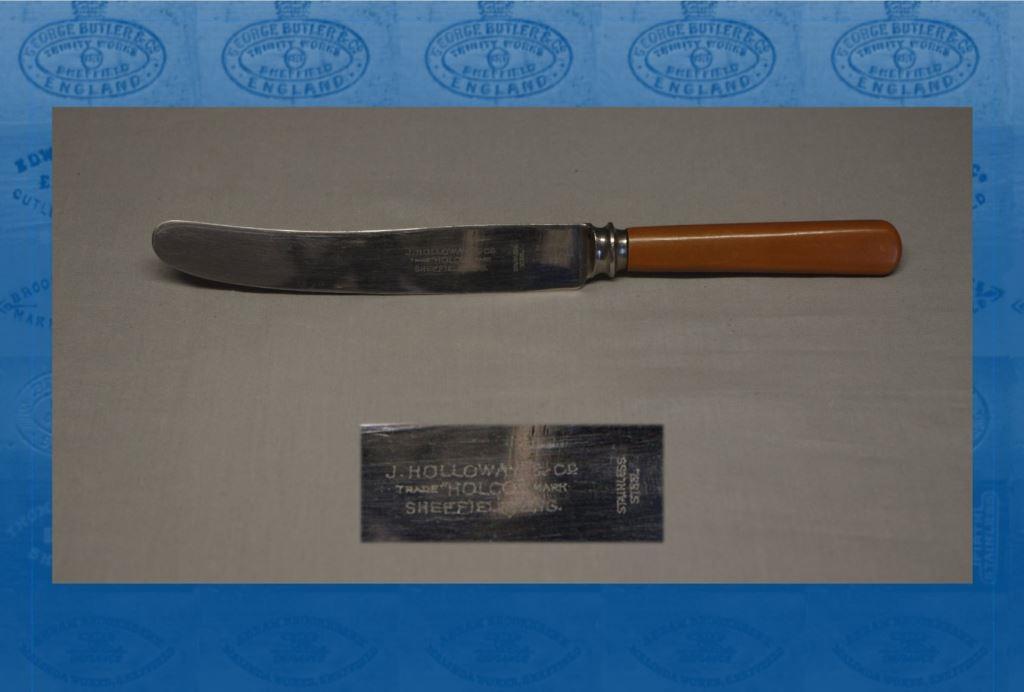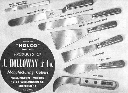 The owner was John Fell Holloway (1905-1967), who had been born in Sheffield. He was the son of John Fell Holloway (a blade forger) and Annie Shaw. In 1939, John Jun. was living at Wentworth Street and described himself as a ‘master forger’, who made surgical and plantation knives (Register of England & Wales, 1939). J. B. Holloway & Co was listed in 1948 at 19-23 Wellington Street as a manufacturer of table, butchers’, pruning, budding, plantation, and shoe knives. By the early 1950s, Holloway’s Wellington Works marketed paint strippers, palette knives, putty knives, lino and hacking knives. Holloway’s was bankrupt in 1957. The trade mark was the word ‘HOLCO’.