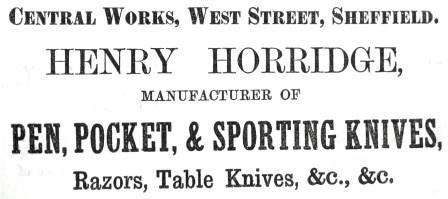 Henry Horridge – George’s son by his wife, Elizabeth – was born on 23 February 1810 and baptised at Howard Street Chapel. He was first listed in 1845 as a razor and spring knife manufacturer in Eyre Street, with a house in Greenhill. He partnered John Fielding Jun. in Howard Street, but this was dissolved in 1861. By 1862, Henry had moved to Central Works in West Street, where he advertised as a maker of pen, pocket, and sporting knives, razors and table knives. He displayed his products at the London International Exhibition (1862), where his principal article was ‘a sporting knife, containing 15 blades and instruments. It is five inches long, the handle of carved pearl, with shield, bolsters and pins of gold; the linings of silver gilt; and the backs of the springs of the blades, etc., are decorated in an elegant style, the manner of which in steel is novel’ (Sheffield Independent, 3 May 1862). In 1871, Henry employed seven men and two boys. By 1883, the address was Portland Works, West Street. Henry Horridge, Newbould Lane, died on 1 September 1890, aged 80. His burial in the General Cemetery was unconsecrated. He left £258. The business was continued for a few years, perhaps by one of his sons, George or Fred. But it was not listed by 1898.