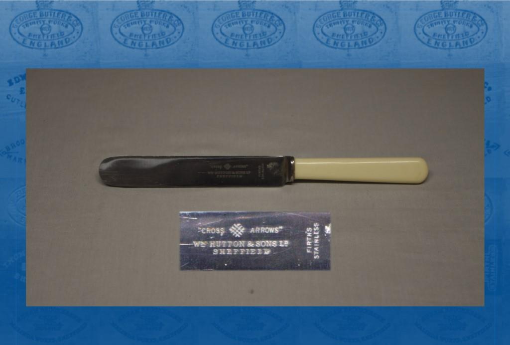 Herbert Hutton took little part in public life, though he was devoted to the Volunteers (which brought him the title of Colonel). As a boss, he ‘never wasted a word … and was abrupt in manner’ (Sheffield Daily Telegraph, 8 June 1904). He died at his mansion Tapton Croft, Tapton House Road, on 7 June 1904, aged 61, after a stroke. According to press reports, nearly 600 workers followed the cortège to Fulwood churchyard. He left £7,779. This was modest compared to the fortunes of some of his competitors in the silver trade. Apparently, this sum was mostly from the auction of Tapton Croft and his country residence, The Moorlands, at Froggatt Edge (Sheffield Daily Telegraph, 27 July 1904). Thereafter, according to one family member, ‘the business lacked [Herbert’s] leadership and drive’ (Hutton, 19563). The family quarrelled and the firm entered the First World War with its future uncertain. In 1915, the Huttons joined James Dixon & Sons, Walker & Hall and Barker Bros, Birmingham, in the Sheffield Flatware Co Ltd. This failed. Wm. Hutton’s experimented with stainless cutlery. An early table knife survives in the Hawley Collection and is marked ‘BRIGHTEST’. But in the 1920s, the factory in West Street was closed and the trade marks and goodwill were transferred to James Dixon & Sons. Cutlery products stamped with the Hutton mark (crossed arrows, which was originally owned by Creswick) continued to be made.